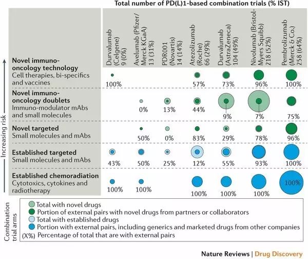 ▲图二:领先药企正在进行的肿瘤免疫学疗法组合试验(图片来源:《Nature Reviews Drug Discovery》)