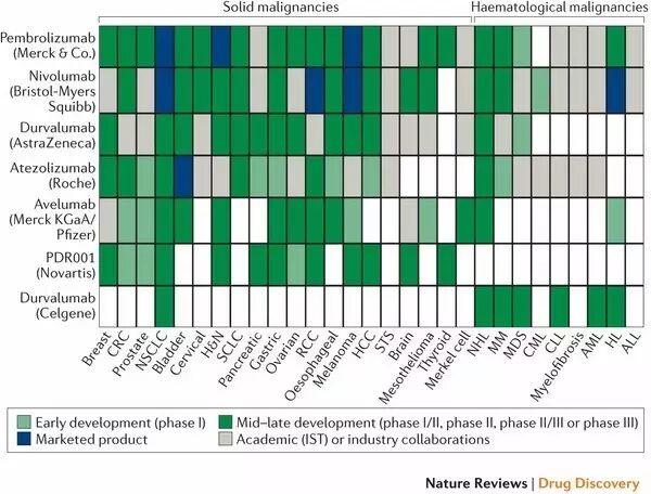 ▲各个主要抗PD1/PD-L1疗法研发项目对癌症适应症的覆盖(图片来源:《Nature Reviews Drug Discovery》)