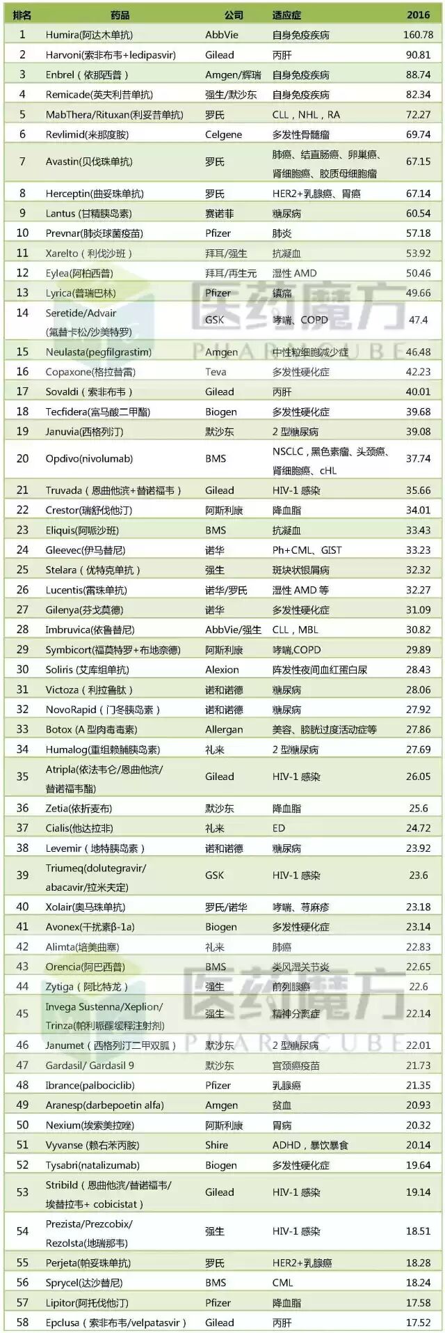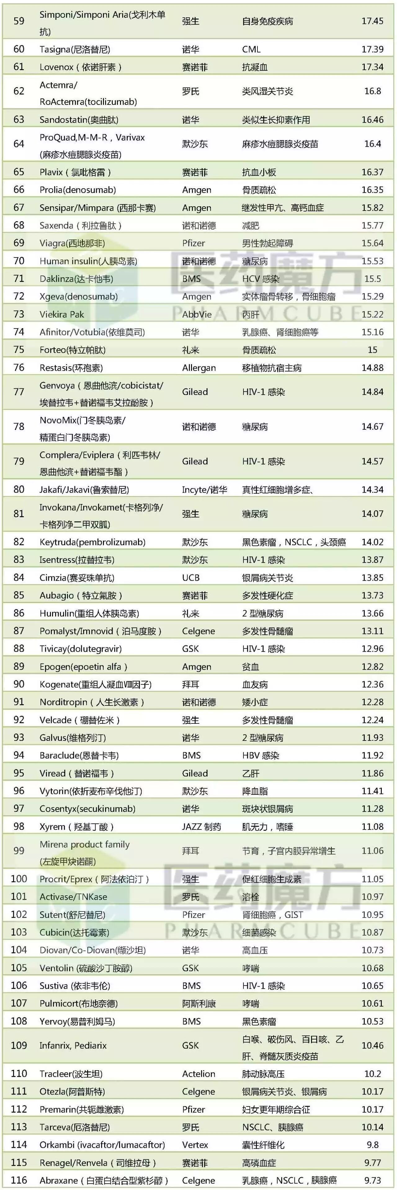 勃林格殷格翰属于非上市公司,产品销售数据未披露。日本药企2016年财报的报告期为2015.4.1-2016.3.31,药品的销售大部分发生在2015年,因此未纳入2016年的统计。