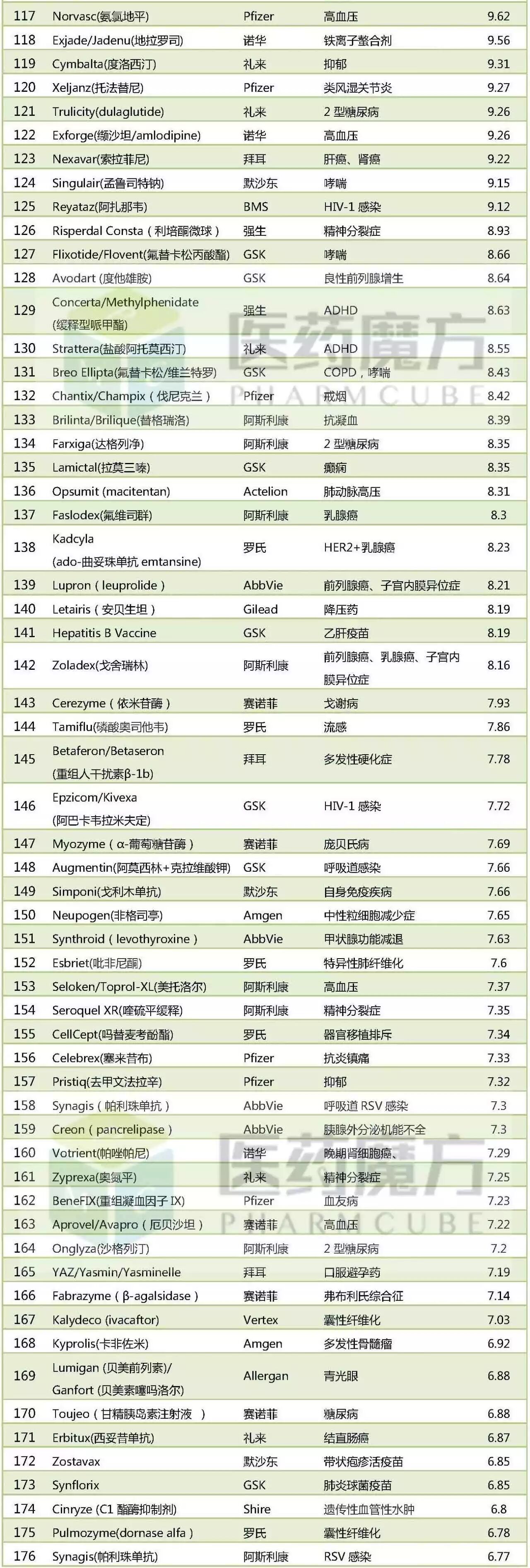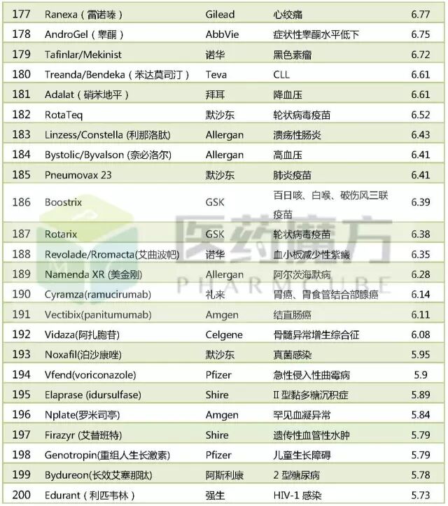 注:TOP200榜单中未包括勃林格殷格翰的Spiriva(噻托溴铵)、Pradaxa(达比加群酯);武田的Velcade (硼替佐米)、Leuplin(亮丙瑞林)、Dexilant(右兰索拉唑)、Blopress(坎地沙坦酯)、Protonix(泮托拉唑);安斯泰来的Vesicare(索利那新)、Xtandi(恩杂鲁胺)、Prograf(他克莫司)。
